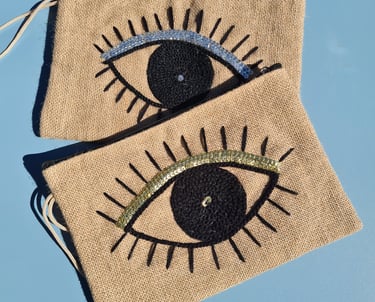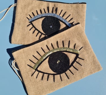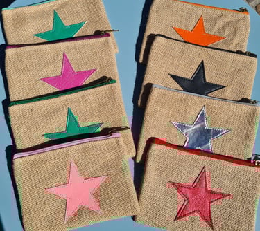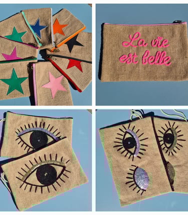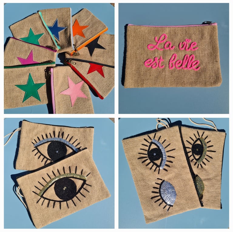 Cette collection est faite main en toile de jute, tissus doublé à l'intérieur et motifs variés :